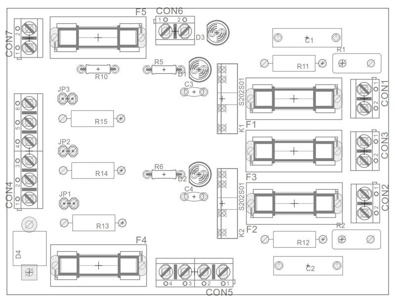Jako další součást automatizační jednotky jsem vytvořil DPS s polovodičovými relátky pro spínání zásuvek a doplnjícími pojistkami. Pro teplotní kontrolér mám DPS s SSR relé . Jako zdroj pro celek slouží MeanWell RS-75-12 (12VDC/6A).