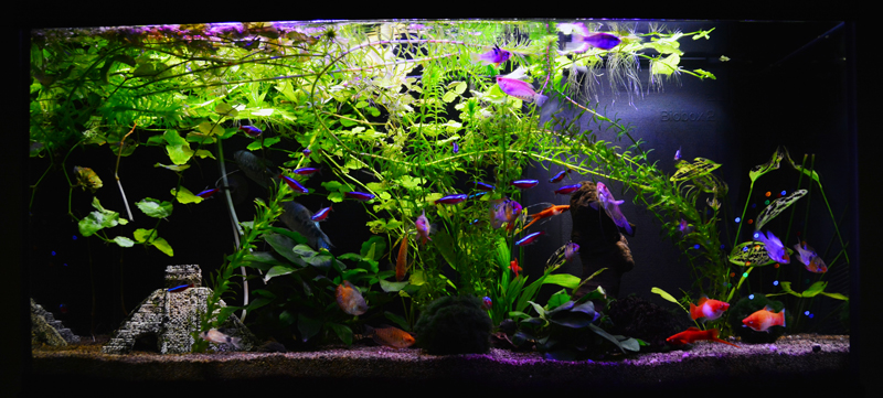 Časy a intenzita osvětlení a vzduchování je individuální, avšak je nutno dodržet pravidla pro zprávný chod akvária. Pro zaběhnutí je potřeba svítit cca. 6 hod. Denně a v případě zaběhnutého akvária je to kolem 10 hodin. Bublinkování/Vzduchování by nemělo být dlouho zaplé při plném svitu ve dne, avšak když světlo nesvítí, mělo by se vzduchovat častěji, kvúli absenci kyslíku z fotosystézy rostlin. Doplňkové osvětlení je řízeno dle denní doby a také pomáhá růstu rostlin. Případné ozónování či CO2 pro růst rostlin už nechám na posouzení odborníka.