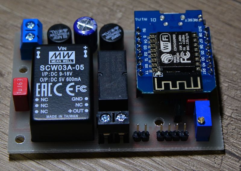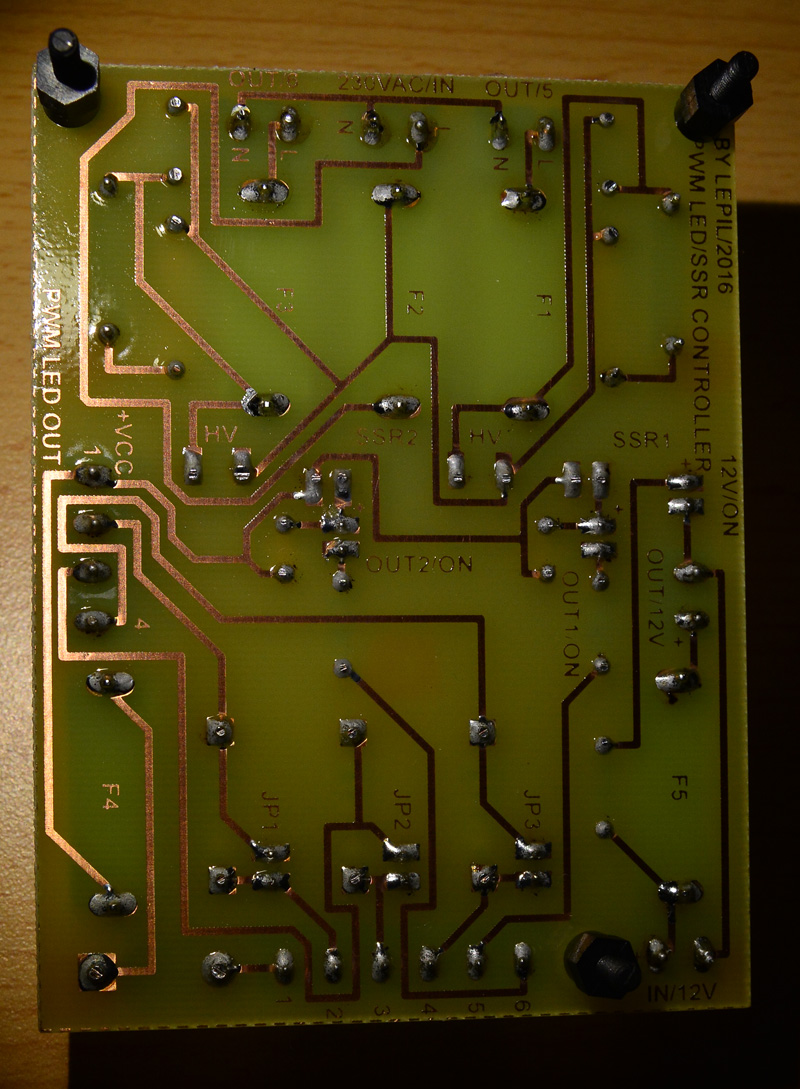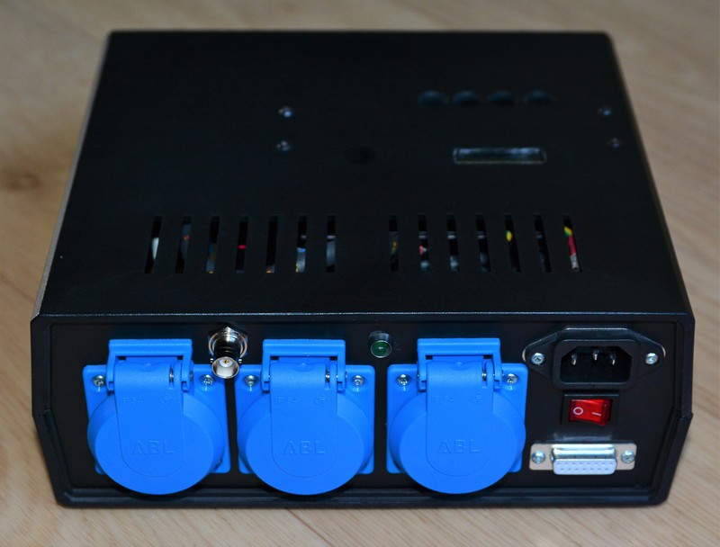 Hlavní deska s relátky a pojistkami má ještě LED indikaci sepnutých relé (nestandartně v sérii s SSR, aby jsem poznal případnou poruchu optočlenu v SSR). Všechny výstupy jsou zapojeny na 3. polohové přepínače, aby bylo možno ovládat (zásuvky a LED výstupy) i manuálně a to v poloze 1 – automatika, poloha 0 – vypnuto, poloha 2 – sepnuto (LED na max. svit).