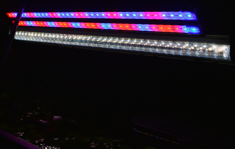 Teď trochu povídání o samotné funkci mého zařízení. Ze třech možných programovatelných LED výstupů zatím používám všechny a to pro hlavní osvětlení, další dva kanály pro světla jsem použil pro simulaci úsvitu a soumraku, jedná se o 16W světla, které mají specifickou vlnovou délku pro růst rostlin, pro úsvit používám světlo s více červenými led( 2Blue/4Red ) a pro soumrak zase s více modrými led ( 4Blue/2Red ).