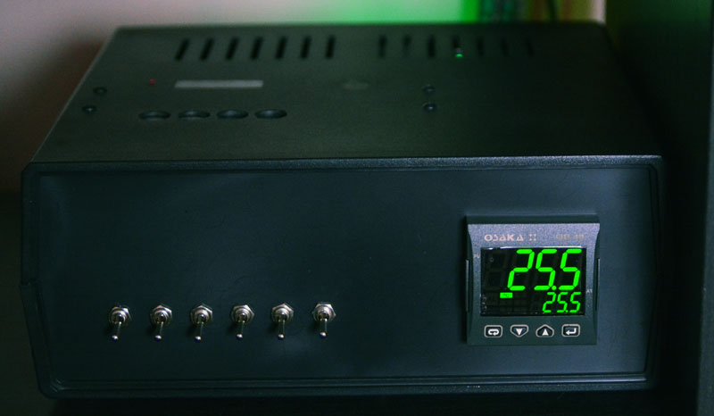 Funkci řízení teploty zajišťuje teplotní kontrolér Osaka QB 48. Tento kontrolér pomocí precizní PID regulace, udržuje teplotu v akváriu v přesnosti +/- 0,1 °C .Termostat je vybaven mechanickým relé, to mám použito pro signalizaci vysoké teploty a sepnutí přídavného ventilátoru nad akvárium. Pro PID regulaci má kontrolér také 12VDC výstup, na který jsem zapojil modul SSR relé, jednak aby nebylo slyšet cvakání a také pro větší spolehlivost, pro PID regulaci, která spíná relé I několikrát za hodinu je SSR relé nutností. SSR Relé ovládá zásuvku napojenou na topítko, v něm je nastavena samozřejmě větší teplota cca o dva, tři stupně větší než budte standatrně nastavovat. V případě selhání kontroléru se pak teplota zastaví přímo topítkovým termostatem. Čidlo pro kontrolér jsem použil vodotěsnou PT1000.