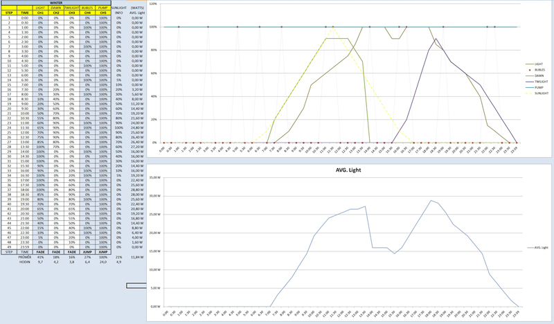 Hlavně pro osvětlení jsem vytvořil graf, který znázorňuje tendeci osvětlení akvária a vliv slunečního světla (aktuální pro zimní období), akvárium mám umístěno sice na protější stěně od oken, ale slunečního světla se tam dostává i tak dost. Vše je tedy smozřejmě závislé na ročním období, můžete si proto nastavit klidně 12 režimů pro každý měsíc. Jednoduše řečeno, dodržím svícení kolem 10hod, když svítí slunce, tak intenzitu lineárně snižím a poté zvýším když už nesvítí. Ano, šlo by sice třeba sledovat ještě intenzitu světla v okolí akvária a dle toho řídit automatiku, ale tento způsob svícení díky časovému automatu je víc než dostačující, nejen, že se plynule reguluje úsvit a soumrak, ale také se zhruba reguluje intenzita v závisloti na svitu slunce v daném období a ryby a hlavně rostliny mají větší komfort bez větších změn. Vzduchování zapínám určitých 0.5-1. hod. Intervalech. Vše ale zavisí na více faktorech, například umístění akvária, chemických hodnot vody, počtu rostlin a ryb v akváriu...V akvaristice jsem začátečník, a tak jen doporučím pročíst články na inernetu, popřípadě nějaké odborné publikace, kde se dozvíte víc.